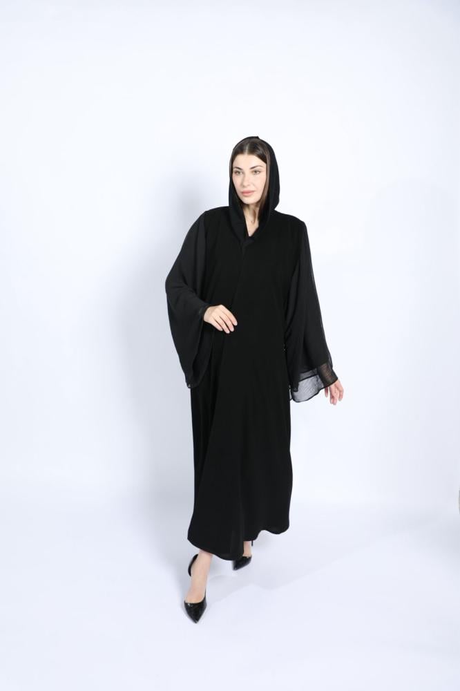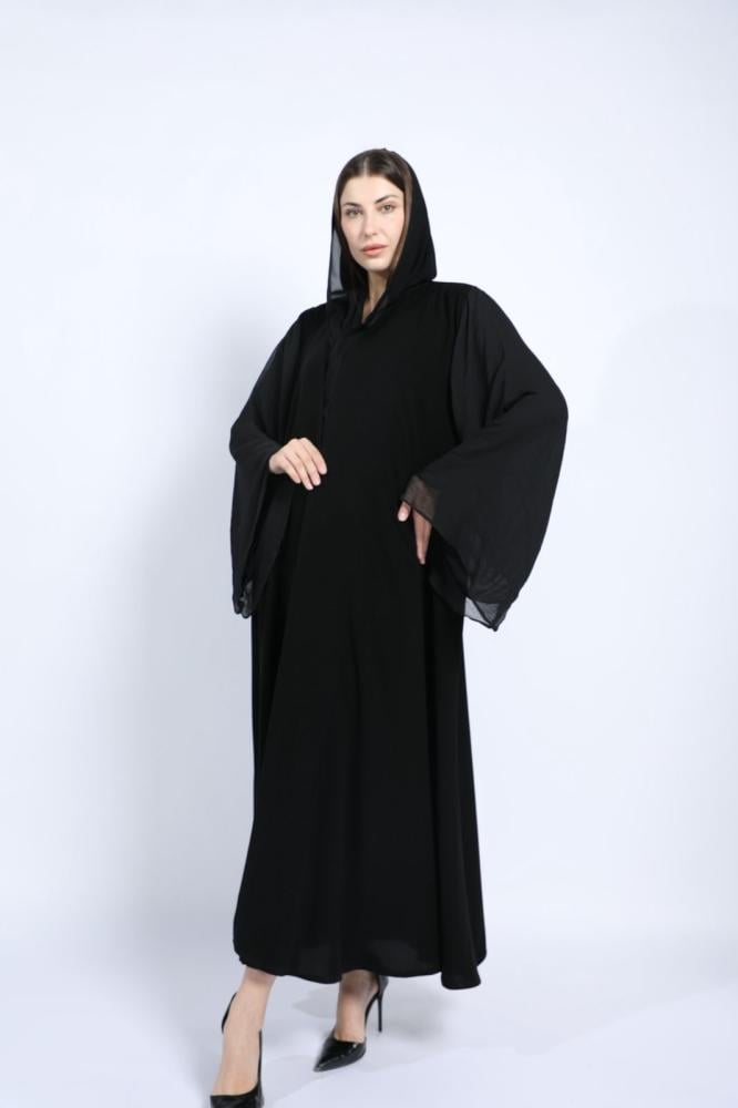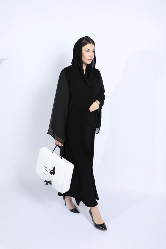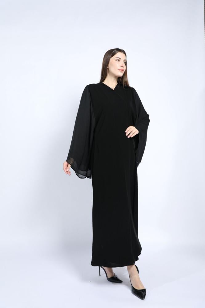 تتألق العباية بتفاصيل أنيقة على الأكمام من خامة الشيفون المنقوشة والمبطنة بعناية، لتضفي لمسة مميزة وراقية. كما تمت إضافة مقوي خاص على أطراف العباية ليمنح التصميم قوامًا ثابتًا ومظهرًا أكثر فخامة، مع الحفاظ على انسيابية القصة