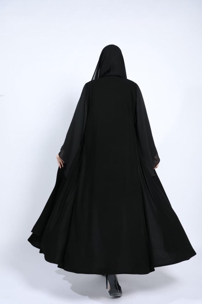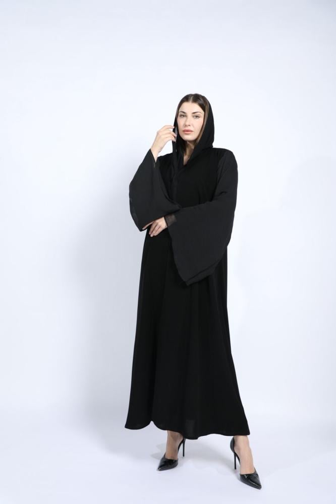 عباية بتصميم نص كلوش انسيابي يعكس الأناقة والرقي، بقصة واسعة تضفي حضورًا مميزًا وفخمًا.